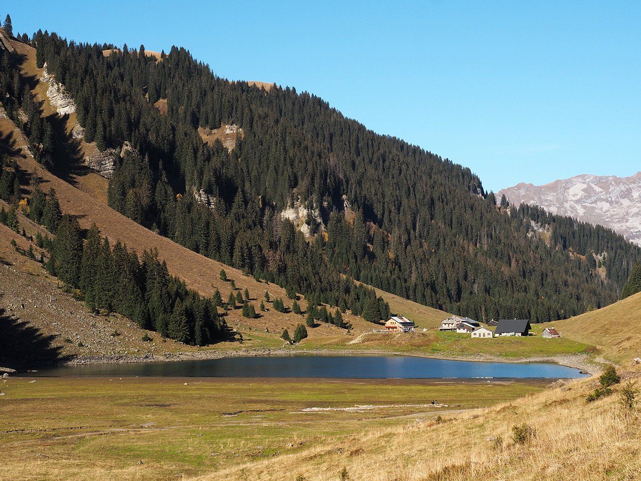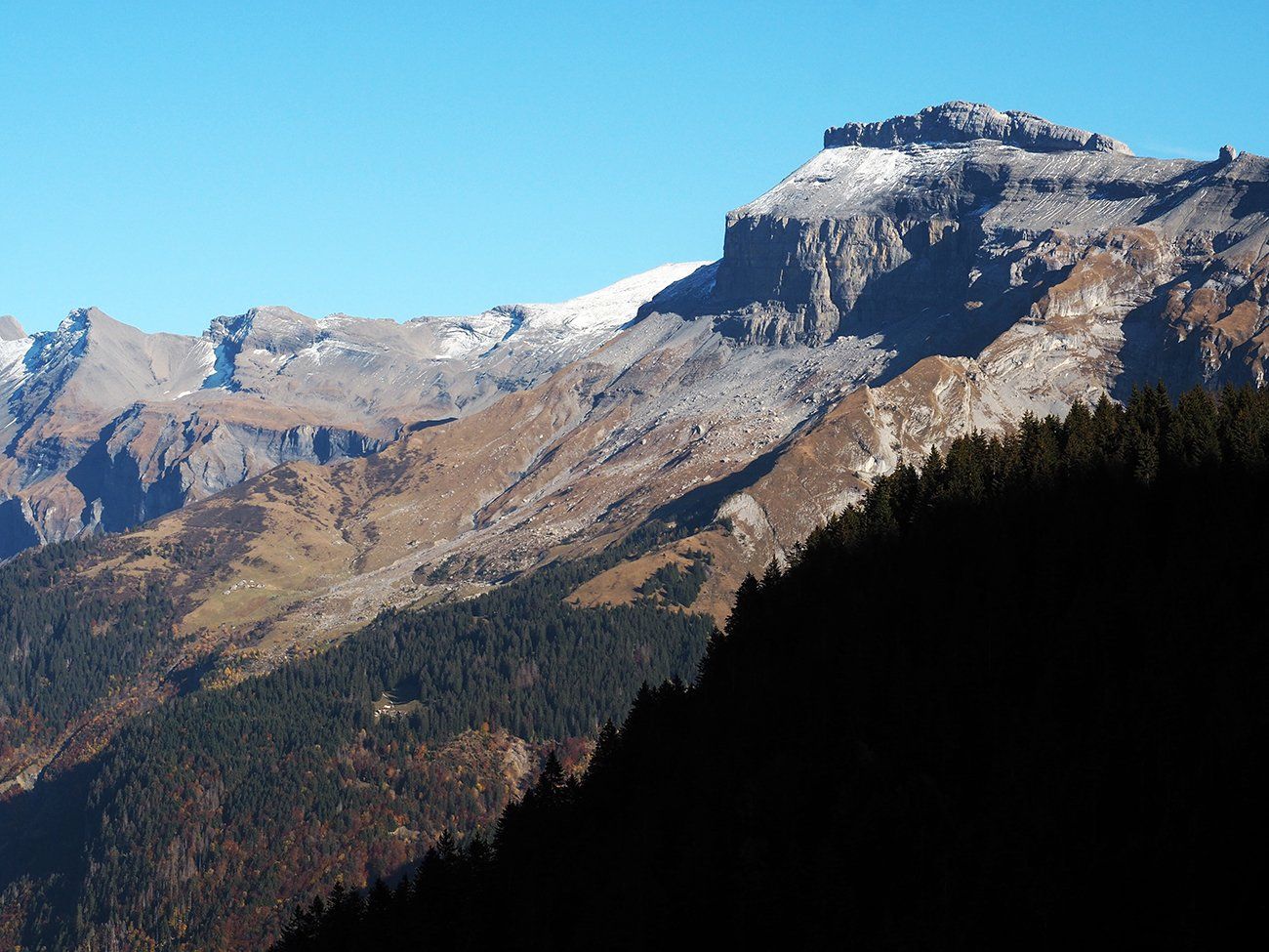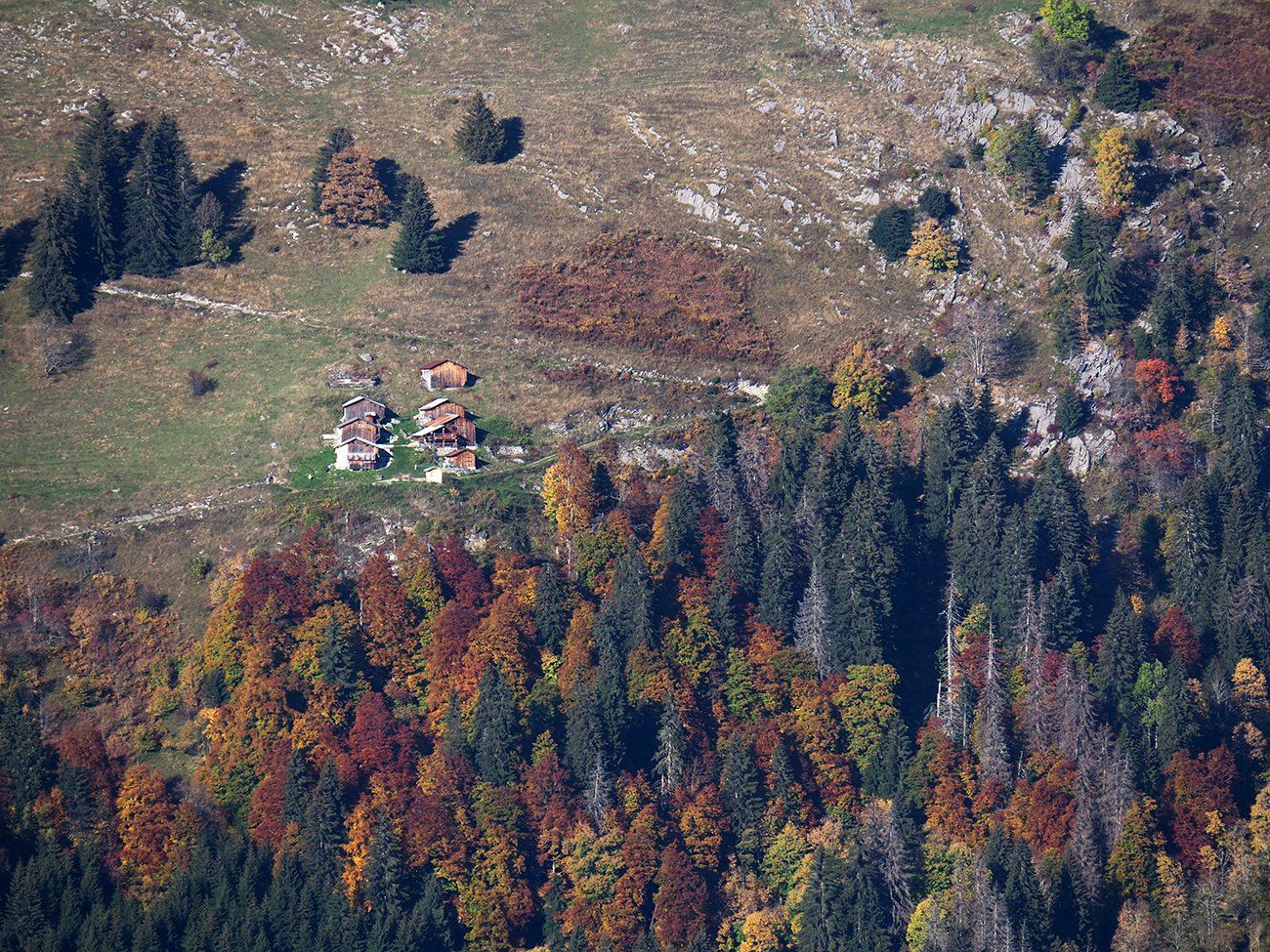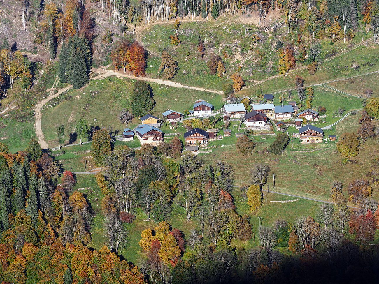 En ce 25 octobre ensoleillé, bovins et ovins ont déjà quitté les alpages de la Combe de Gers, cette calme terrasse située en surplomb de Sixt Fer-à-Cheval, Samoëns et la Vallée du Haut-Giffre.