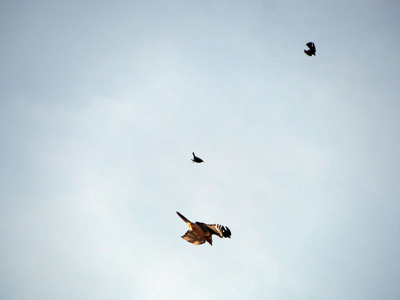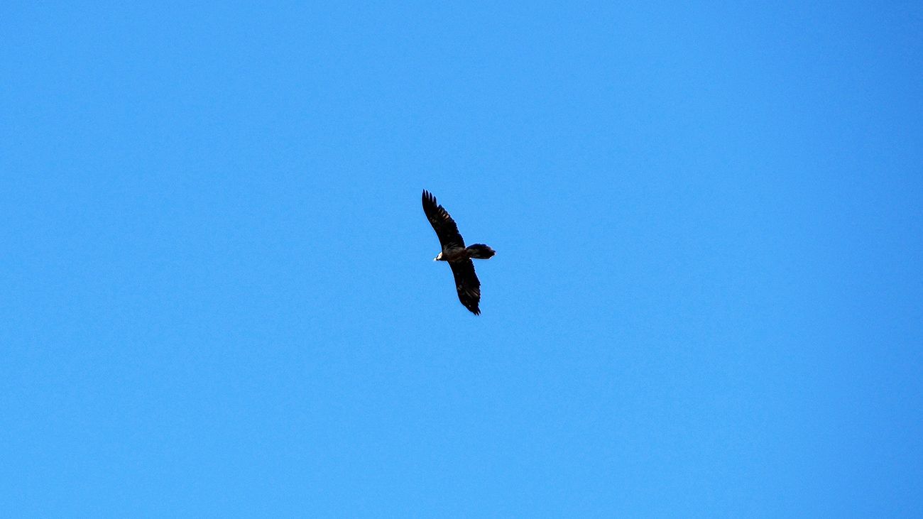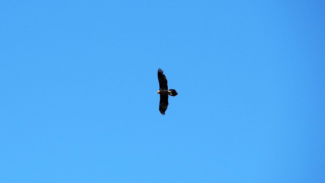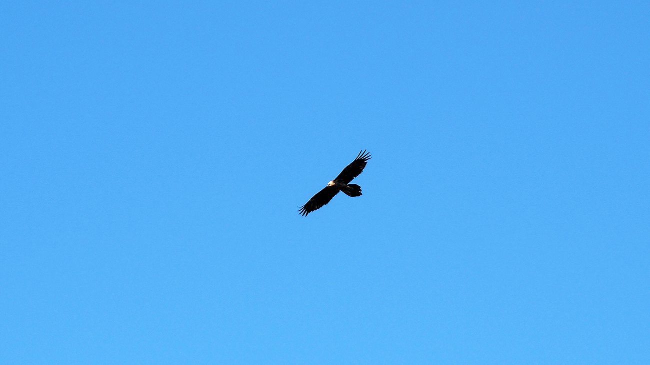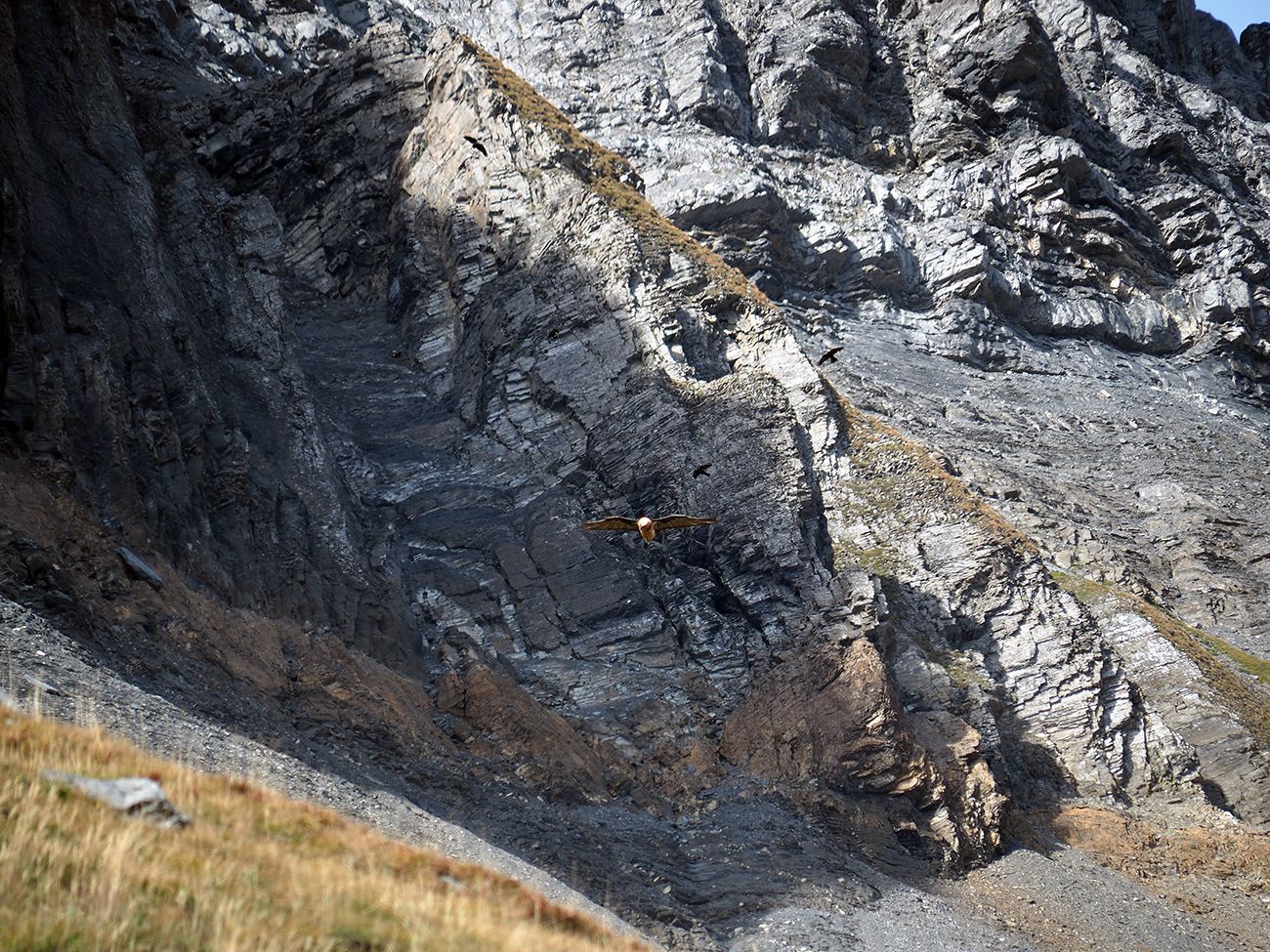 Le gypaète était escorté par un duo de chocards à bec jaune, qui semblait le poursuivre, à moins que ce soit pour jouer avec ce majestueux spécimen du plus grand rapace européen.