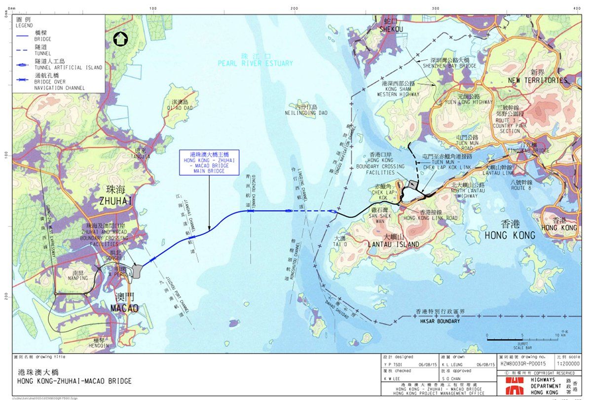 Près de l'aéroport international Chek Lap Kok mis en service en 1998 et situé sur une île artificielle gagnée sur les eaux au nord de l'île de Lantau, la partie du HZMB de 9,4 km raccordant l'ouest de Hong Kong a été réalisée par le groupe français Bouygues Construction, en partenariat avec China Harbour.