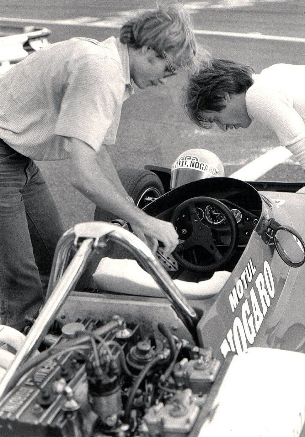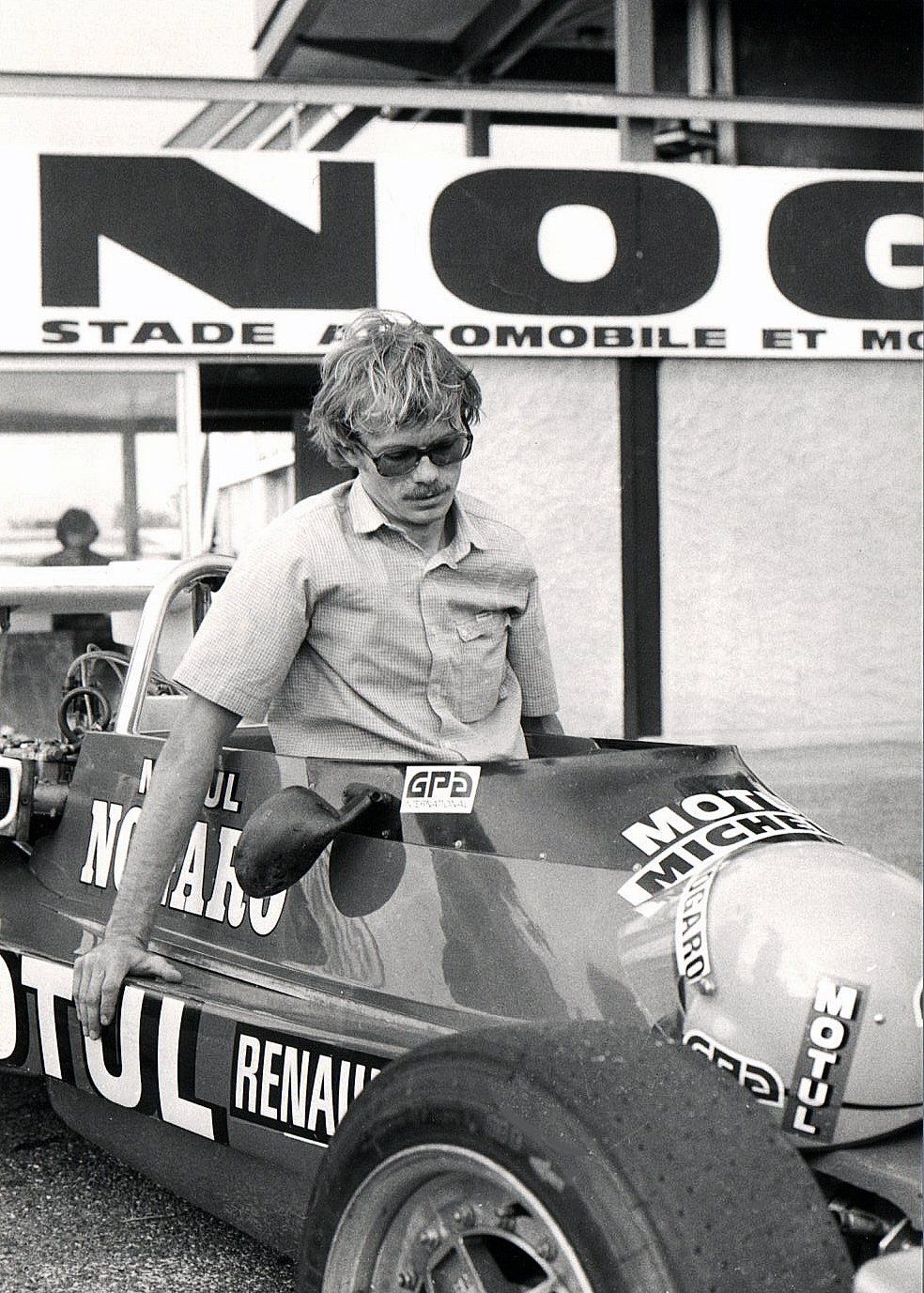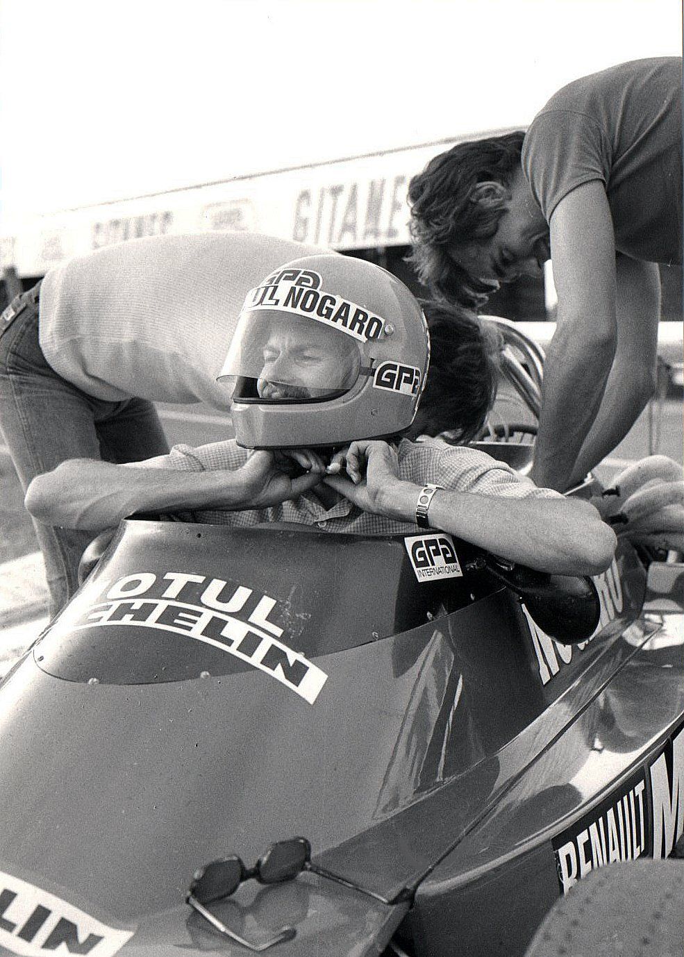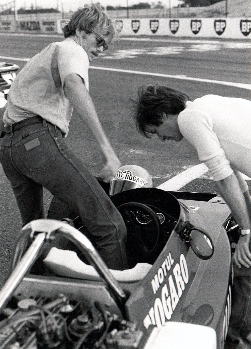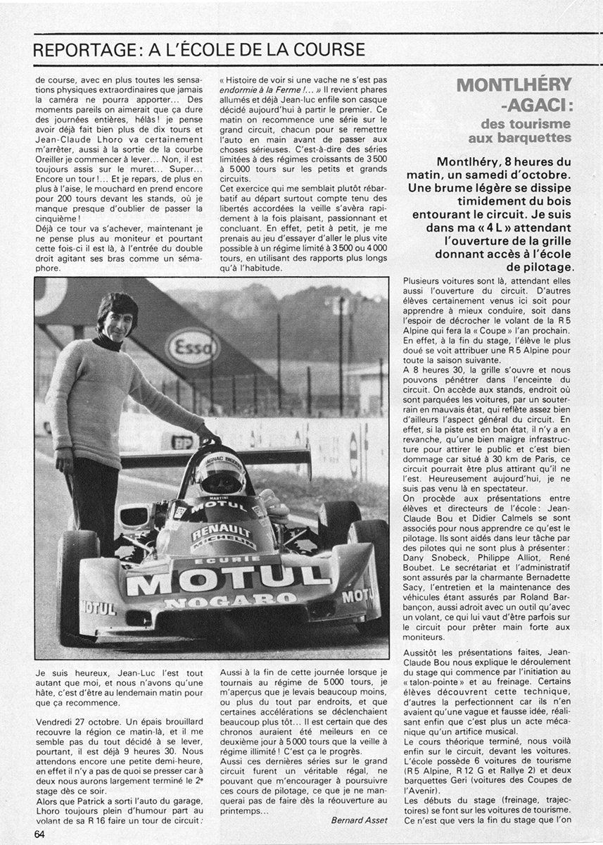 Alors que j'étais un correspondant rédacteur-photographe régional depuis 1975 pour la revue Echappement, ainsi que depuis 76 pour Auto-Hebdo, je venais d'accepter la proposition du rédacteur-en-chef Jean-Claude Lamorlette de migrer vers la capitale pour le poste de photographe à plein temps du mensuel, à partir de janvier 79. Parallèlement à cette perspective d'obtenir le statut officiel de journaliste arriva peu après l'invitation d'aller participer à un stage spécial de deux jours à l'école de Pilotage de Nogaro. Pour les besoins d'un sujet magazine, en compagnie de Bernard Asset, le discret mais talentueux et déjà célèbre jeune photographe de Grand Prix. Lui allait rédiger l'article, et moi jouer le figurant de l'illustration devant ses objectifs (voir photos).