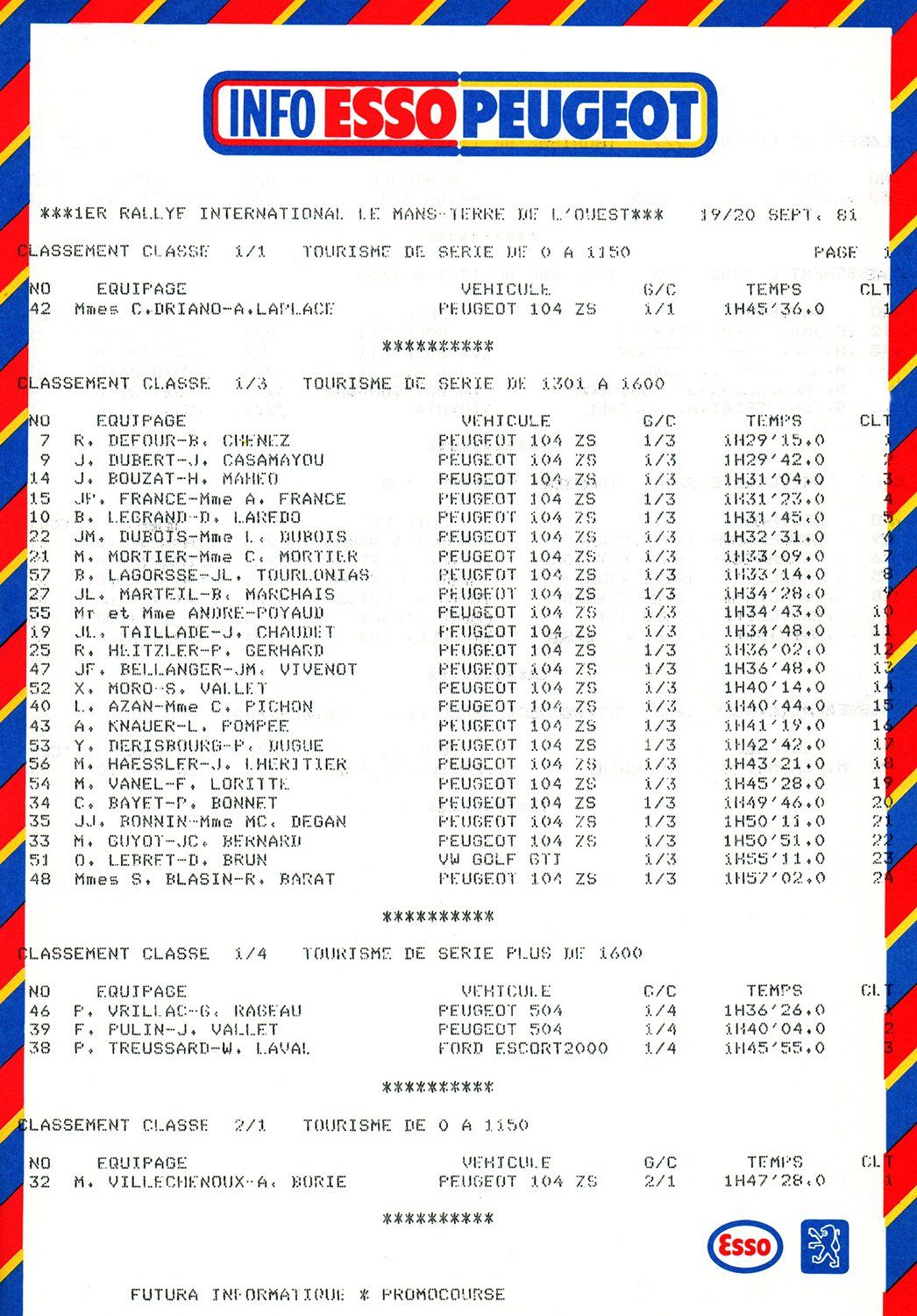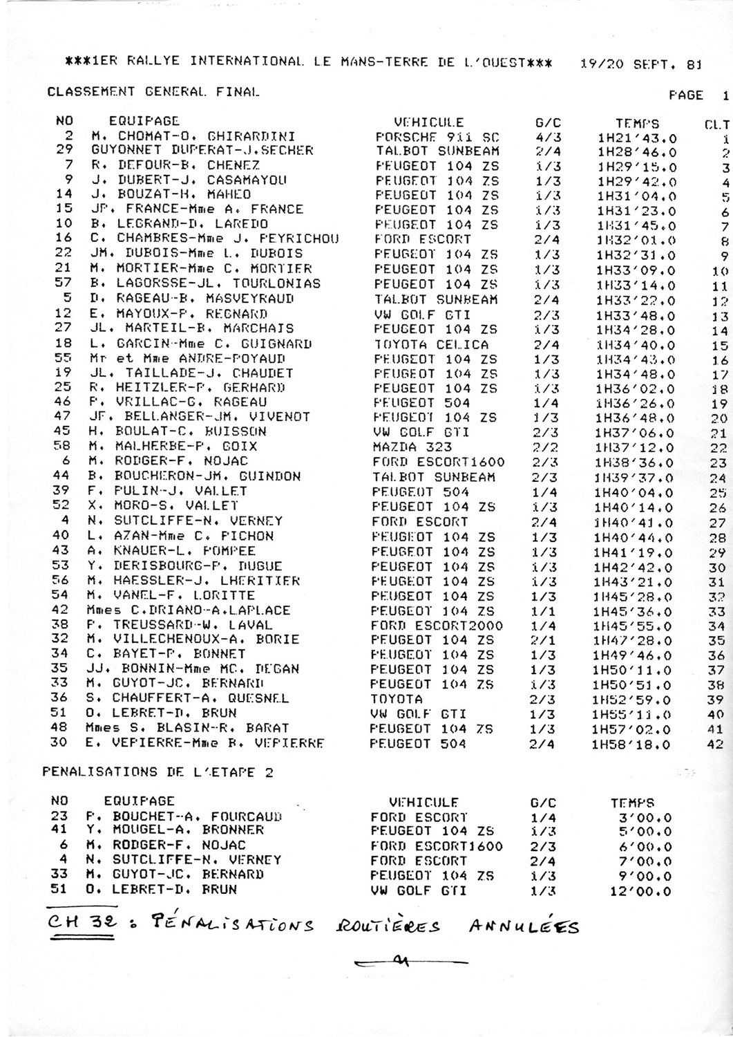 Finalement, ce sont deux crevaisons qui décidèrent de notre 11e place finale au tableau des 104 de la Coupe, coiffés sur le fil par le couple isérois André-Poyaud. La première sur le routier à la sortie de la pénultième spéciale, puis la seconde dans les derniers kms de l’ultime chrono. Au point de faire du stop “roue de secours“, la nôtre étant déjà consommée. Et merci encore à l’un de nos suivants, dont le prêt nous permit de rejoindre le parc d’arrivée dans les délais.