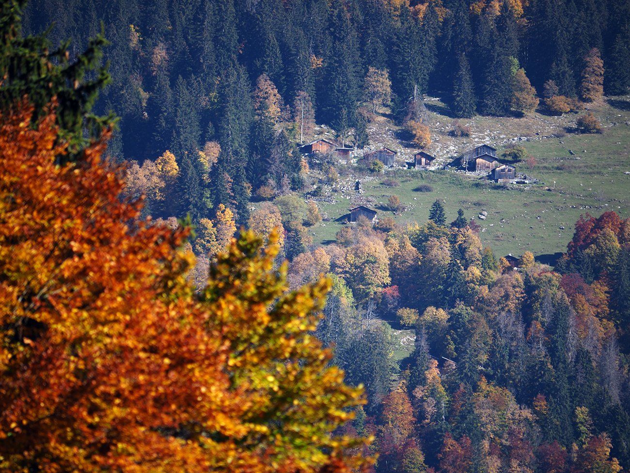 En ce 25 octobre ensoleillé, bovins et ovins ont déjà quitté les alpages de la Combe de Gers, cette calme terrasse située en surplomb de Sixt Fer-à-Cheval, Samoëns et la Vallée du Haut-Giffre.